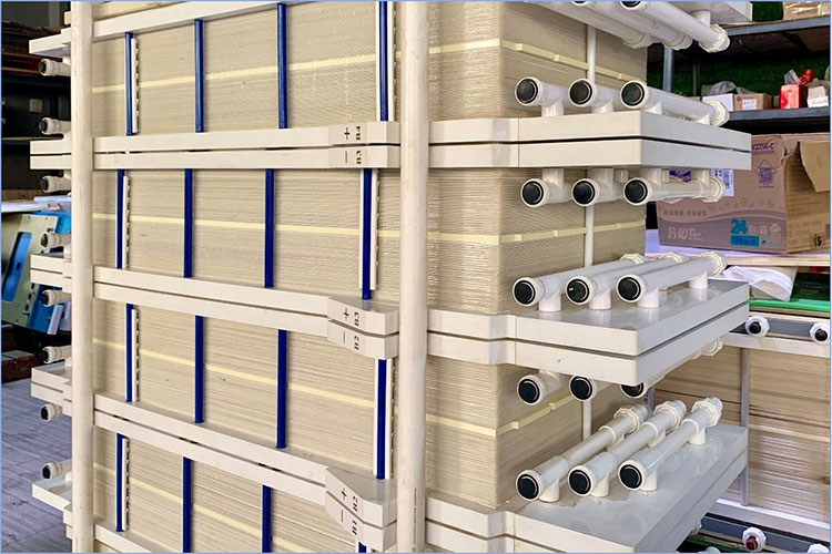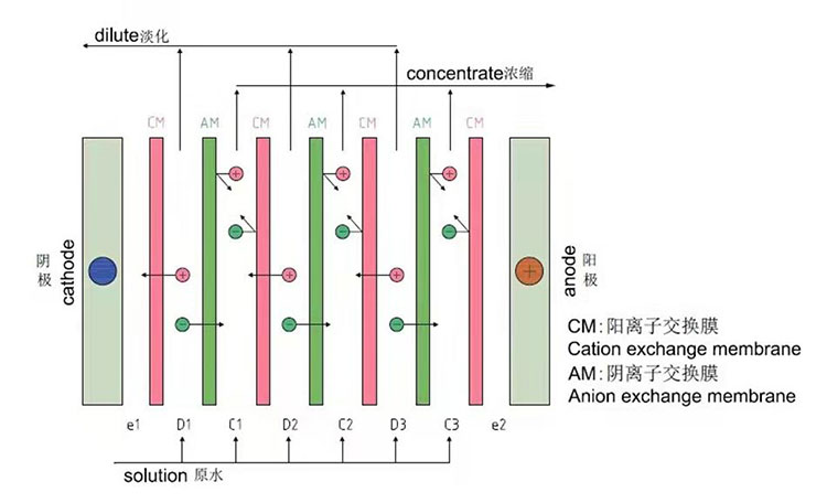 電滲析(ED)是在直流電場(chǎng)作用下,利用荷電離子膜的反離子遷移原理從水溶液和其他不帶電組分中分離帶電離子的膜過程,是一個(gè)以電位差為推動(dòng)力的膜分離過程。在電滲析器內(nèi)設(shè)置多組交替排列的陰、陽離子交換膜,在直流電場(chǎng)作用下,陽離子穿過陽膜向負(fù)極方向運(yùn)動(dòng);陰離子穿過陰膜向正極方向運(yùn)動(dòng)。這樣就形成了去除水中離子的淡水室和濃縮離子的濃水室,將濃水排放,得到的淡水即為去鹽水。這一過程就是電滲析除鹽的原理。