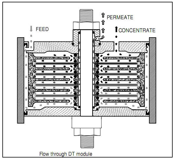 在高壓泵提供的動(dòng)力下,高鹽廢水進(jìn)入膜堆與外殼之間的間隙后通過導(dǎo)流通道進(jìn)入底部導(dǎo)流盤中,被處理的廢水以最短的距離快速流經(jīng)過濾膜,然后180º逆轉(zhuǎn)到另一膜面,再從導(dǎo)流盤中心的槽口流入到下一個(gè)過濾膜片,從而在膜表面形成由導(dǎo)流盤圓周到圓中心,再到圓周,再到圓中心的切向流過濾,濃縮液最后從進(jìn)料端法蘭處流出。高鹽廢水流經(jīng)過濾膜的同時(shí),透過液通過中心收集管不斷排出。濃縮液與透過液通過安裝于導(dǎo)流盤上的O型密封圈隔離。
