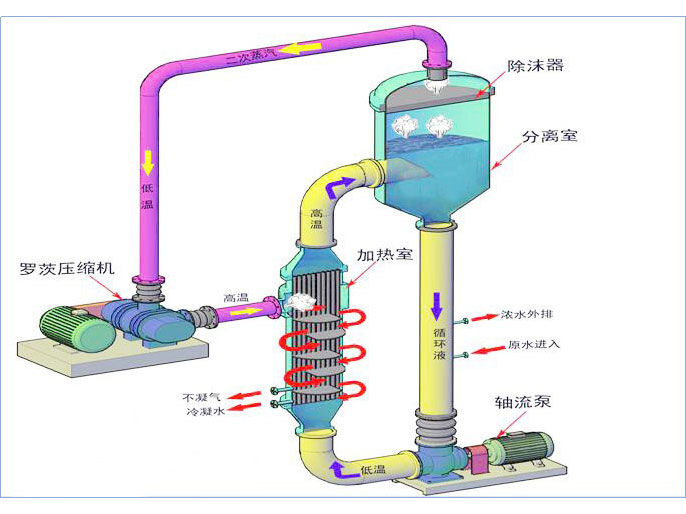 MVR是機械蒸汽再壓縮技術(Mechanical Vapor Recompression)的簡稱。指將蒸發(fā)過程的二次蒸汽(溫度低、壓力低而無法利用)用壓縮機進行壓縮,提高其溫度、壓力,重新作為熱源加熱需要被蒸發(fā)的物料,從而達到循環(huán)利用蒸汽的目的,使蒸發(fā)過程不需要外加蒸汽,即用少量的電能獲得較多的熱能,從而減少系統(tǒng)對外界能源的需求的一項高效節(jié)能技術。